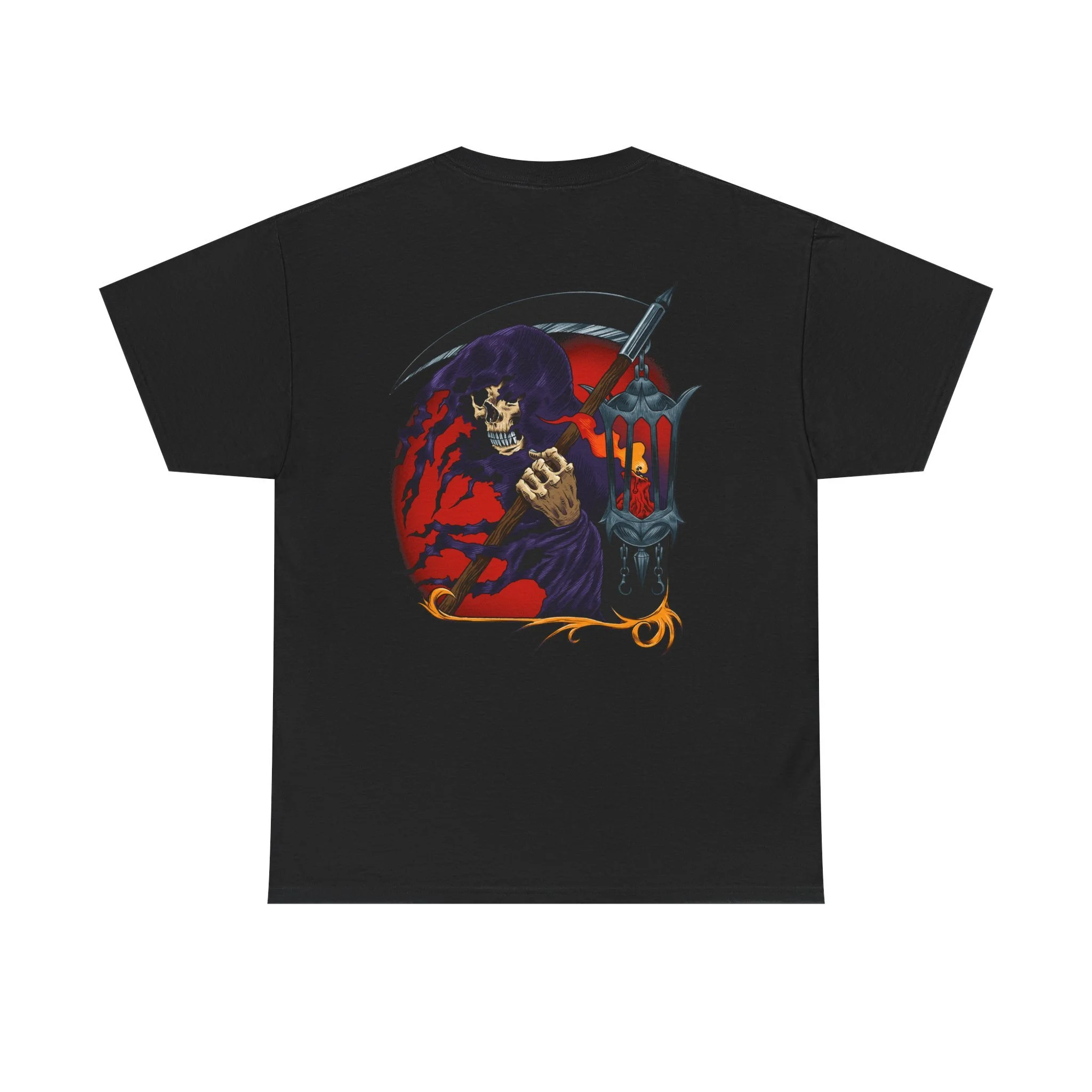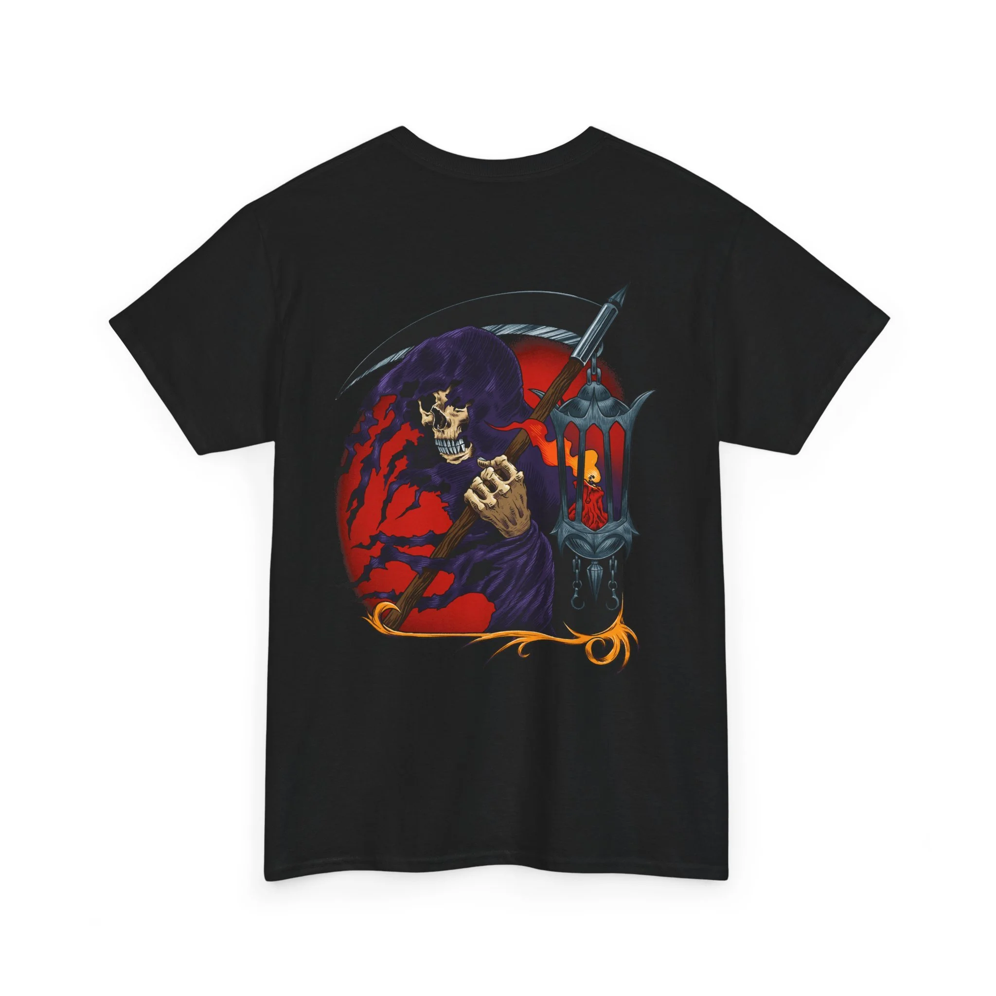 This Tee features a design of a Grim Reaper with Lantern on the back, giving off a dark and mysterious vibe. Perfect for those who love edgy, gothic-inspired fashion. Ideal for Halloween, themed parties, or everyday wear for fans of the macabre.